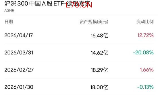 投资A股的沪深300中国A股ETF-德银嘉实(ASHR)本周也获得资金净流入。4月13日至4月17日,资金净流入合计超1900万美元。从资产规模来看,截至4月17日,该基金规模从3月底的14.62亿美元,增至16.48亿美元,增幅达12.72%。