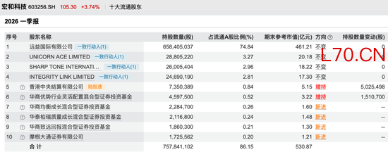 截至一季度末,宏和科技前十大流通股东