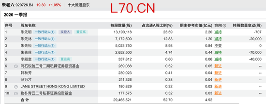 截至一季度末,朱老六前十大流通股东