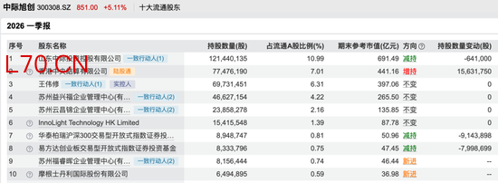截至一季度末,中际旭创前十大流通股东