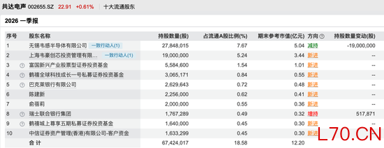 截至一季度末,共达电声前十大流通股东