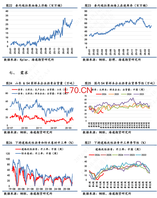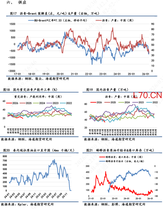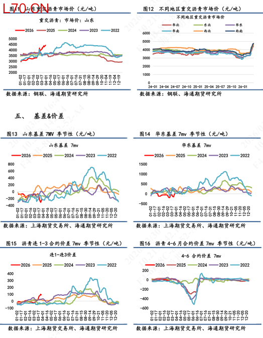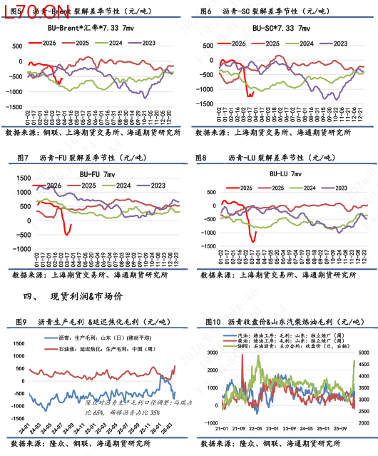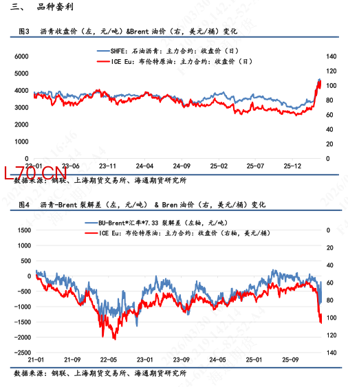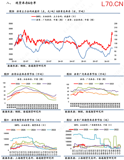 【2】现货基本面:截止3月27日当周,供应端,国内炼厂产量为34.1万吨,环比下跌10%;需求端,大样本国内企业出货量为22.86万吨,同比下跌2%;库存端,厂内+社会库存累计106.4万吨,环比上涨0.5%。其中厂库录得52万吨,环比回落1.7%;社会库存录得54.4万吨,环比上涨3%(仍未突破2025年均值线)。利润端,隆众统计的3月29日沥青生产毛利为-439元/吨,环比毛利亏损有所收敛。