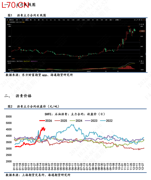 元股证券:ygzq.hk【1】期货盘面:3月26日国内收盘,BU 2606主力合约震荡上行。收盘价4543,较上个交易日收盘价环比上涨4.2%。盘中最高触及4599,最低4408。04近月合约环比上涨4.14%。