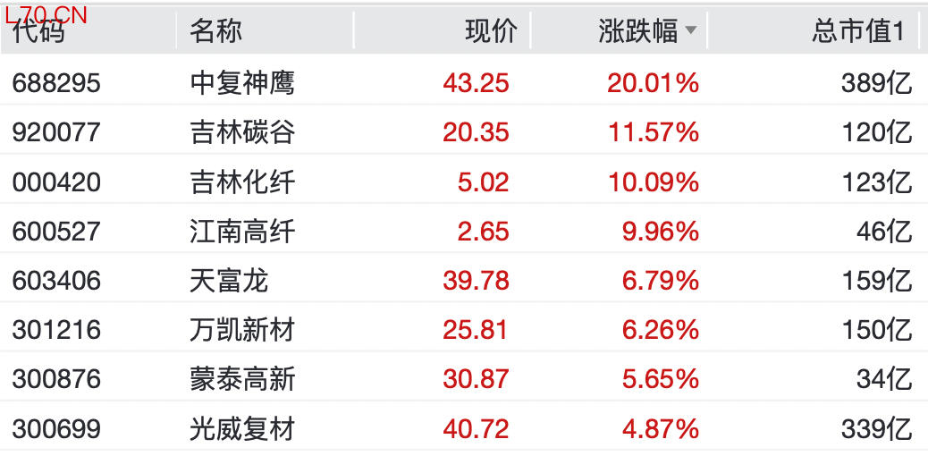 宝丰能源涨逾6%,三房巷一字涨停,中复神鹰录得20cm涨停,皖维高新、吉林化纤、江南高纤均录得10cm涨停。