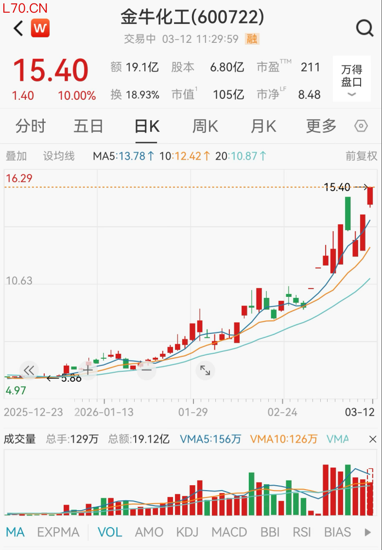 金牛化工走出9天5板,现报15.4元/股,最新市值为105亿元。