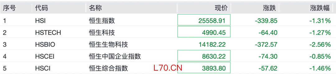 港股市场同步下挫。截至发稿,恒生指数跌1.31%,恒生科技指数跌1.27%,恒生生物科技指数跌2.56%。个股方面,腾讯控股跌超1%,阿里巴巴跌逾2%,比亚迪、美的集团、小米集团纷纷下跌。