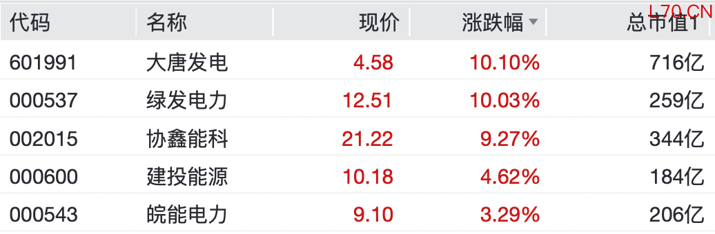 个股方面,绿发电力、华电能源录得3连板,大唐发电、节能风电涨停,协鑫能科涨超9%。