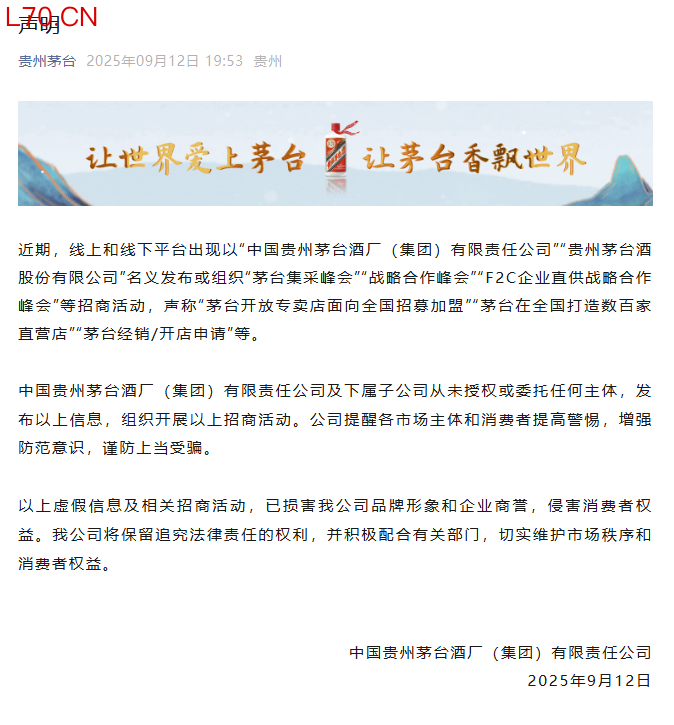 茅台集团:未授权或委托任何主体发布或组织“茅台集采峰会”等招商活动平台官方网站