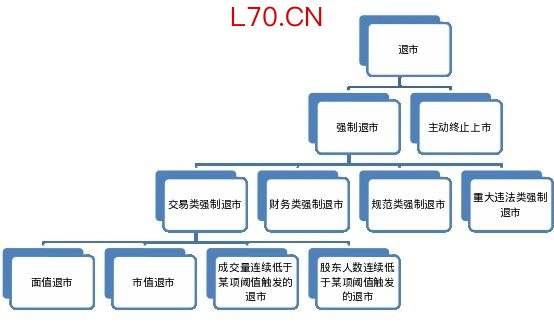 A股市场目前已形成多元化退市格局,根据交易所目前规定,退市包括强制终止上市(简称“强制退市”)和主动终止上市。其中,强制退市分为交易类强制退市、财务类强制退市、规范类强制退市和重大违法类强制退市等几种情形。这里面,交易类强制退市又分为面值退市、市值退市、成交量持续低于某项阈值而触发的退市、股东人数连续低于某项阈值触发的退市等情形。
