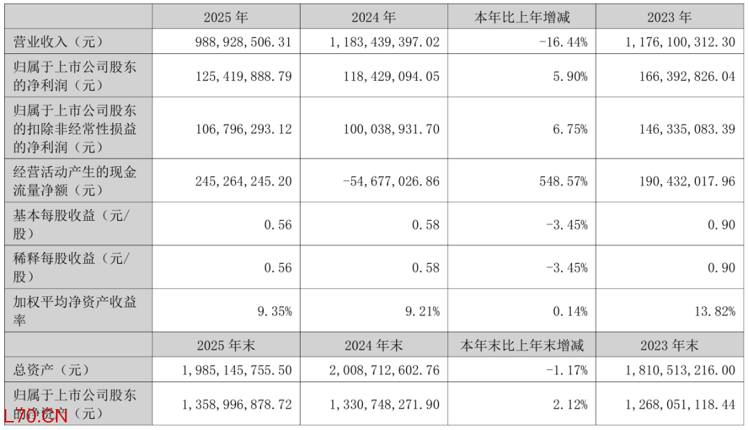 2025年,芯瑞达实现营业总收入9.89亿元,同比下降16.44%;归母净利润1.25亿元,同比增长5.90%;扣非净利润1.07亿元,同比增长6.75%。